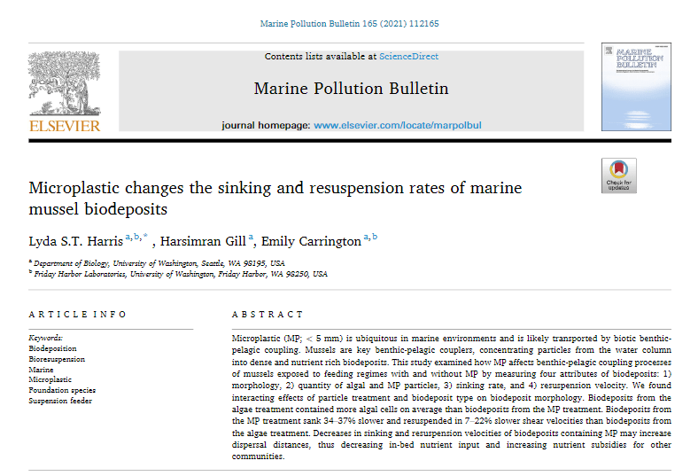 Hot off the press: Microplastic changes the sinking and resuspension rates of marine mussel biodeposits, published in Marine Pollution Bulletin. This is the second chapter of my PhD dissertation and work that I did with three amazing undergraduates while at UW Biology. Harsimran Gill, a co-author, was one of those undergrads and this is his first paper.