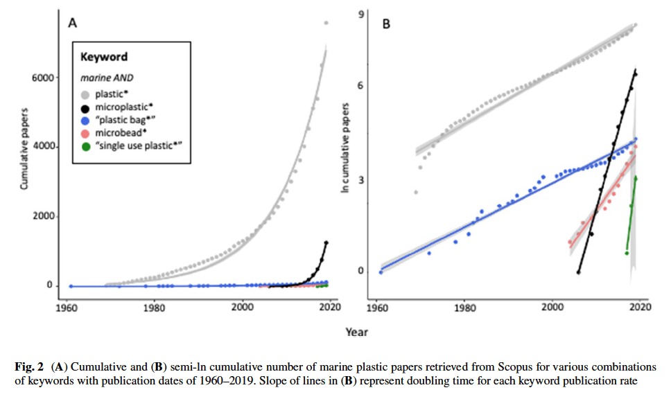 Interestingly, both areas—research and policy—have seen sudden growth spurts. For microplastic science, the number of papers published started doubling every 1 to 4 years. And policy growth wasn’t far behind, doubling roughly every 3 to 4 years.