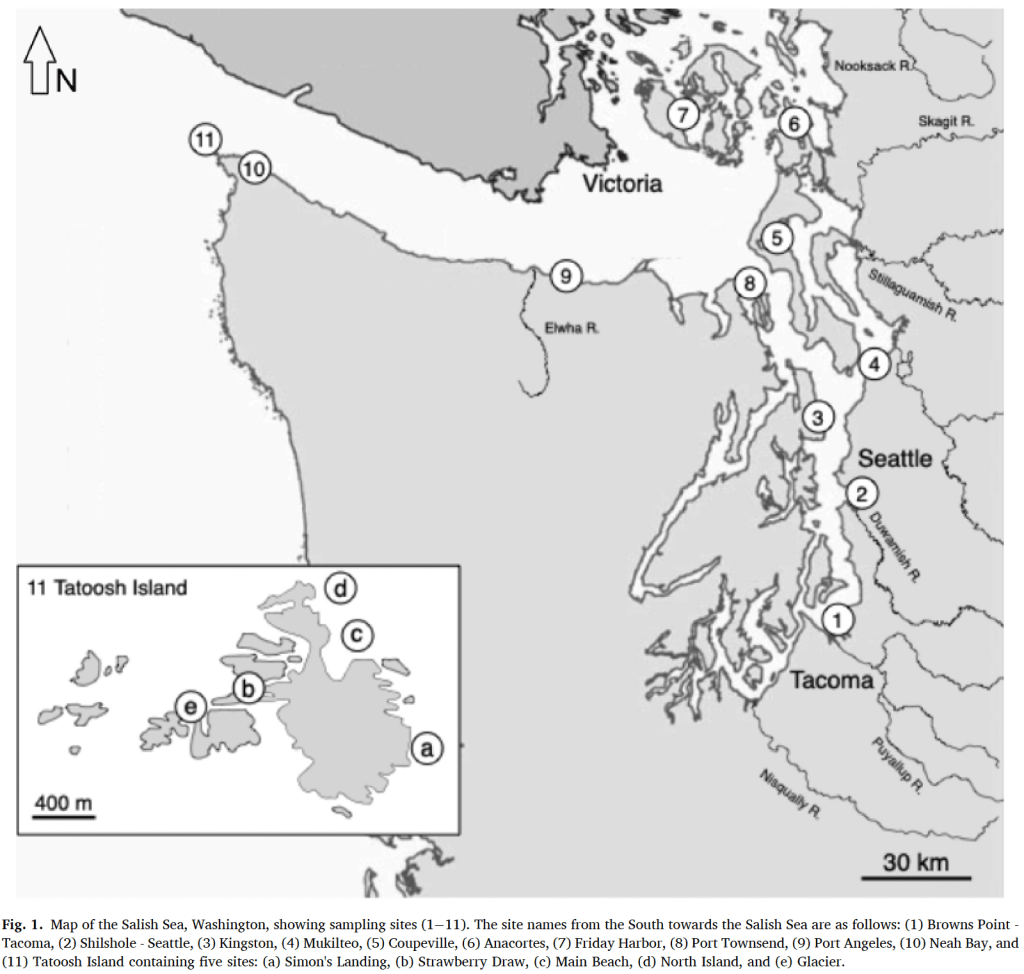 To investigate regional and localized pollution patterns, this project collected mussels from 15 sites across the Salish Sea, including urban marinas and a remote island, Tatoosh. We used a rigorous wet oxidation process to dissolve mussel tissue, then vacuum filtered the samples to capture micro-sized particles. Every step was done under contamination-controlled conditions. Microparticles were analyzed for shape, color, and size with microscopy and ImageJ, and polymer analyses were done with Raman spectroscopy. Data were analyzed using R with a mix of nonparametric and multivariate statistical tests to compare particle concentration, shape, and color across sites.